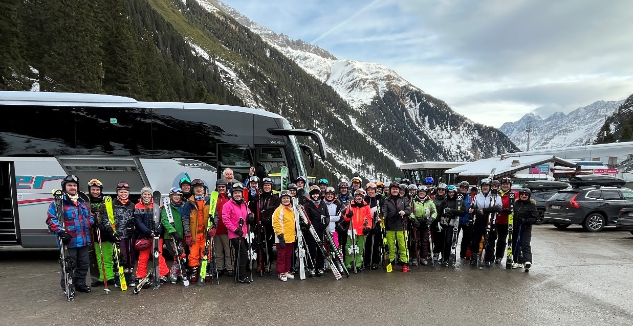 Pünktlich um 6:00 Uhr, nachdem alle Skier u. Gepäck im Bus verstaut waren, fuhren 36 Skifahrer/Innen noch etwas müde aber gutgelaunt Richtung Allgäu. Unser Busfahrer Werner Mager chauffierte uns in gewohnter souveräner Weise nach Zöblen auf den Parkplatz am Skilift. Dort ging es nach Erhalt der Liftkarten ab auf die Pisten.